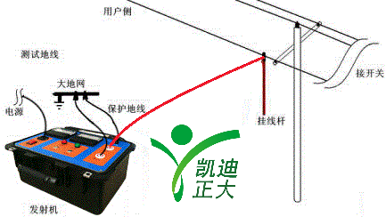 接线:首先将故障线路的开关断开;发射机电源接220V市电;保护地线接“保护地”端子和大地网;测试地线(带黑色夹钳的高压导线)接“测试地”插座和大地网;至于接故障线路的输出线,可根据现场情况,使用短连接线(带红色夹钳的高压导线)接“线路”端子和开关柜的线路侧,若必须接在架空的线路上,则选用接线盘装的长连接线,其高压插头接“线路”端子,其另一端的线鼻压接在绝缘挂线杆的接线柱上,再将挂线杆挂在故障线路上。