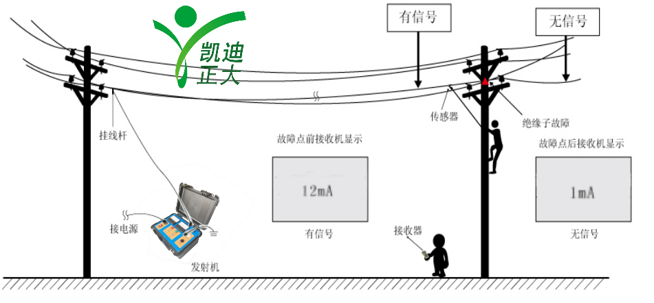 在地面上的接收机接收传感器发送的无线信号,在液晶屏上直观显示测量结果。在故障点前,电流持续存在;故障点后,电流消失。可先进行粗略分段,再精确定点,从而快速确定故障位置。