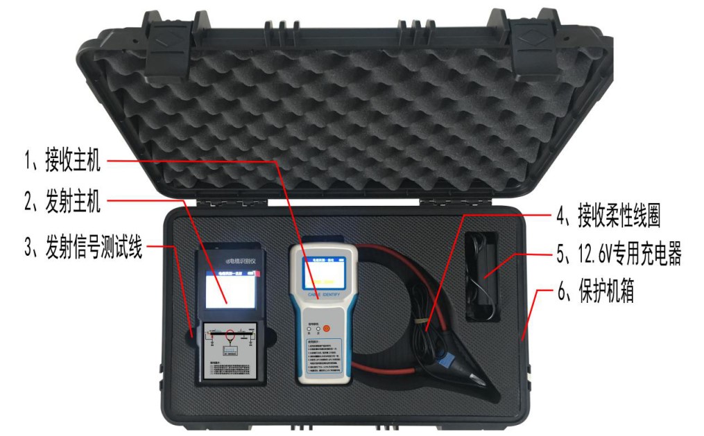 2、该电缆识别仪与常规的识别仪不同,采用了最新的通信技术,在发射端采用单片机技术对发射信号进行编码、功率驱动,将信号耦合到电缆上;接收机中的单片机对接收的相位编码信号解码和相位识别。根据目标电缆上的信号相位特征的唯一性将目标电缆从一大束电缆中识别出来。因此工作性能可靠,对超长电缆也能做到准确判别,是一种轻小型、紧凑型、便携式仪器。适用于各种类型的高低压动力电缆。