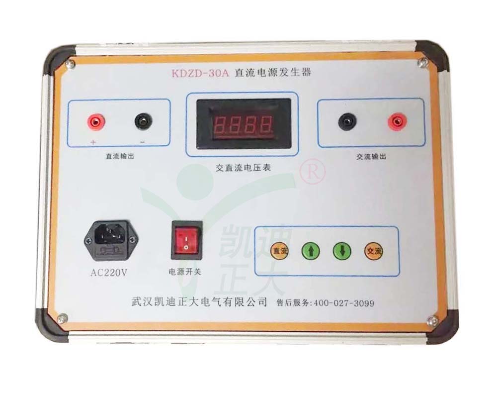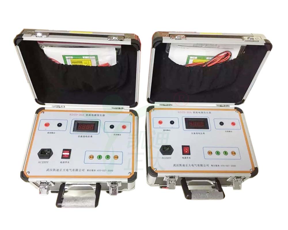 KDZD-30A 交直流开关电源发生器亦称高压开关检测操作电源,是为对高压断路器及其操作机构进行检测维修而设计的专用电源,具有电压可调、操作简单、体积小、携带方便等优点,是高压开关检修的工具。