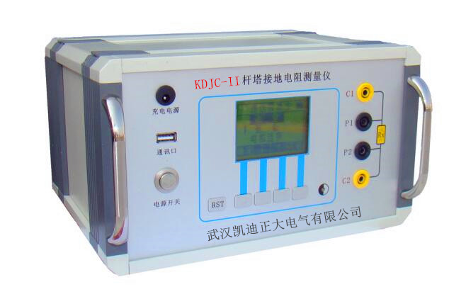 KDJC-II型杆塔接地电阻测量仪适用于测量避雷线直接接地的输电线路杆塔接地电阻,杆塔塔身和本档避雷线电阻、后续(或两侧)各档链行回路等效阻抗中的电阻分量等形成一个回路,通过测量仪内部电源电势,在该回路中产生电流,通过全电路欧姆定律得出所测杆塔的接地电阻值。