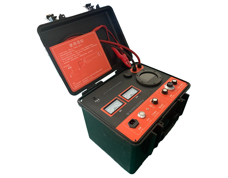 设备采用开关电源构成高压恒流源,采用高灵敏度放大器及检流计指示平衡,与比例电位器构成平衡电桥,整体置于高电位。测试线为特别设计的双芯高压橡皮电缆,采用四端电阻测量法避免了引线电阻引入的误差,面板上操作钮处于地电位,通过绝缘杆操作电桥。高压恒流源和电桥集成在一个便携式工业塑料机箱内。因此,该设备电压高、重量轻、操作方便、使用安全。